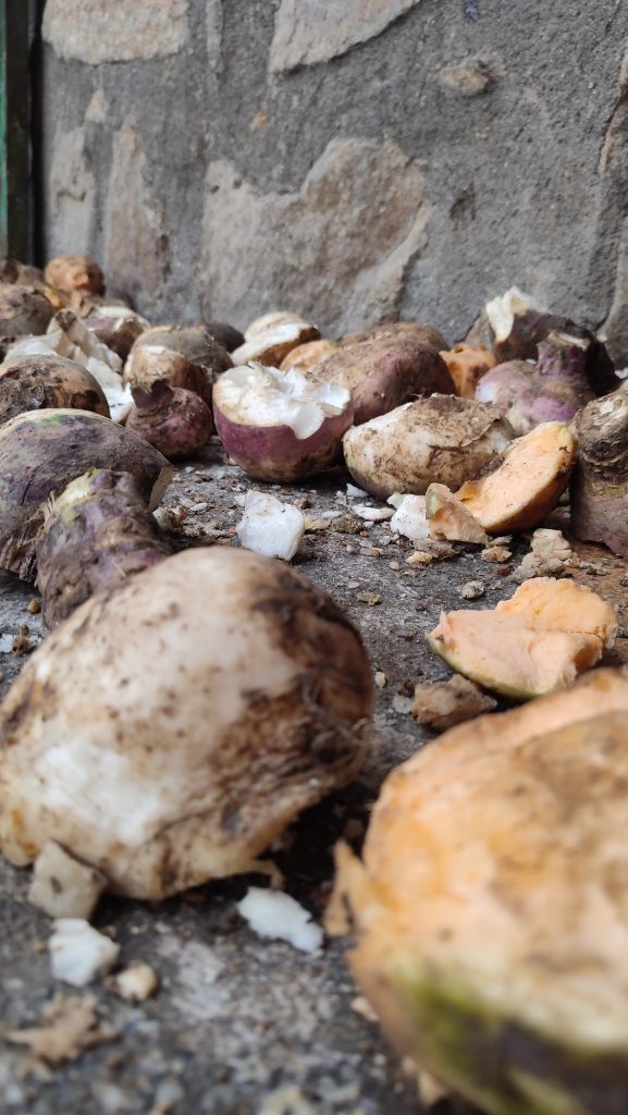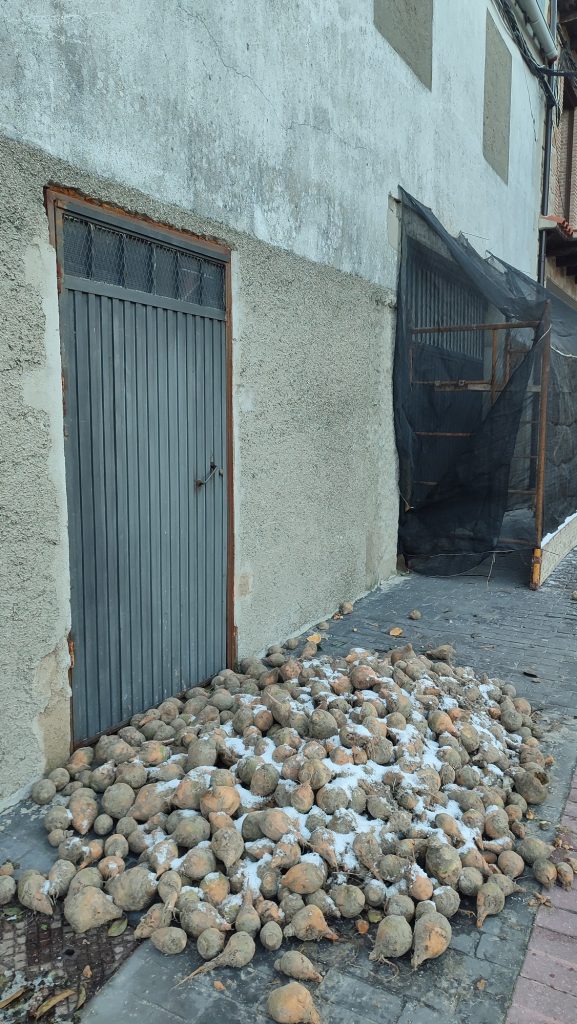 Una vez allí y después de haberme adentrado levemente en el pueblo, me aconsejaron que aparcase a la entrada, lo comprendí cuando empecé a caminar por las calles del pueblo y me encontré la impactante imagen de las casas cubiertas con lonas y demás, y el suelo lleno de nabos en diferentes puntos, por donde ya intuyes que serán el recorrido.