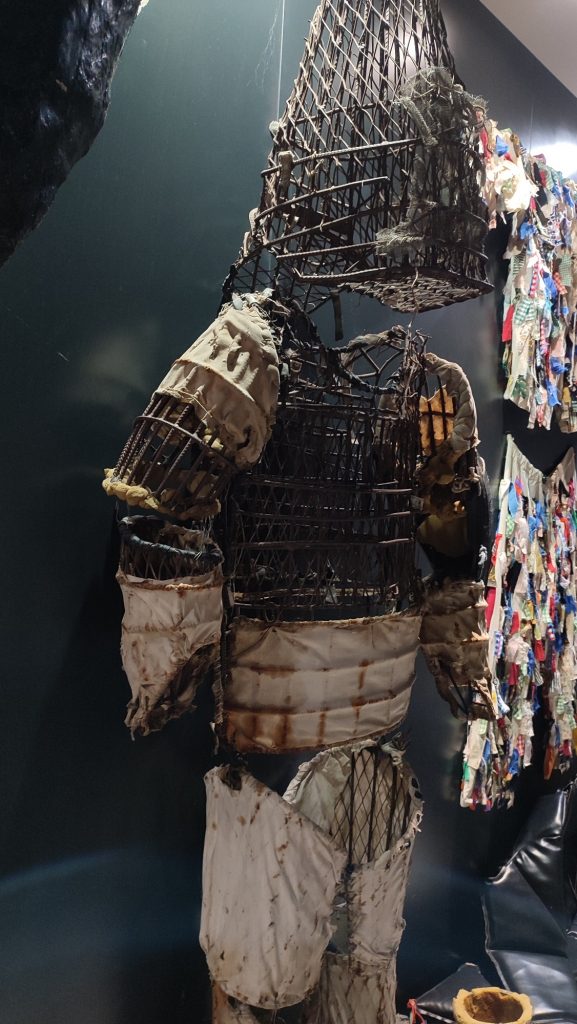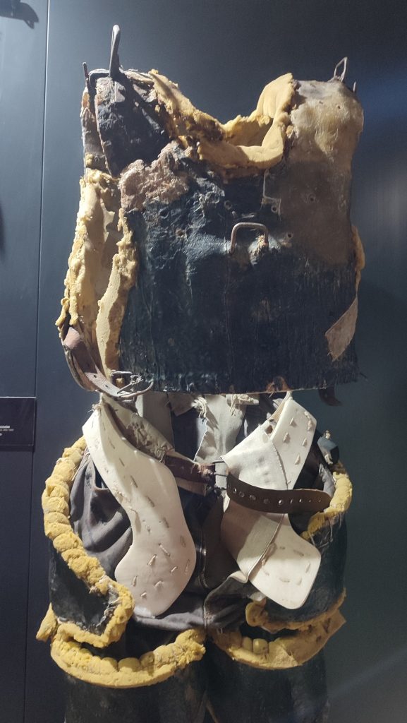 Os estaréis preguntando ¿Qué lleva el señor Jarramplas puesto para aguantar semejantes golpes?, en el museo se pueden ver algunas de las corazas internas que lleva tras el traje de cintas de colores y varias máscaras de distintas épocas, las actuales son de fibra de vidrio al igual que el traje, porque pesa menos.