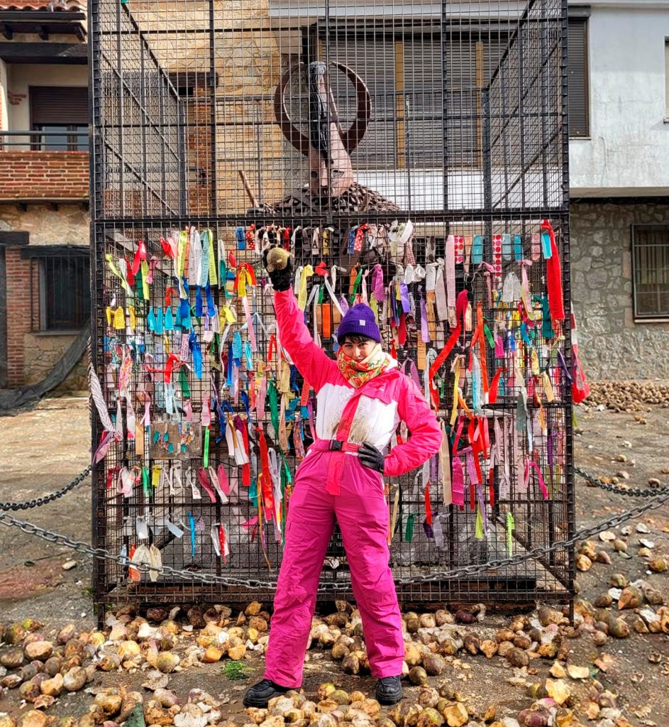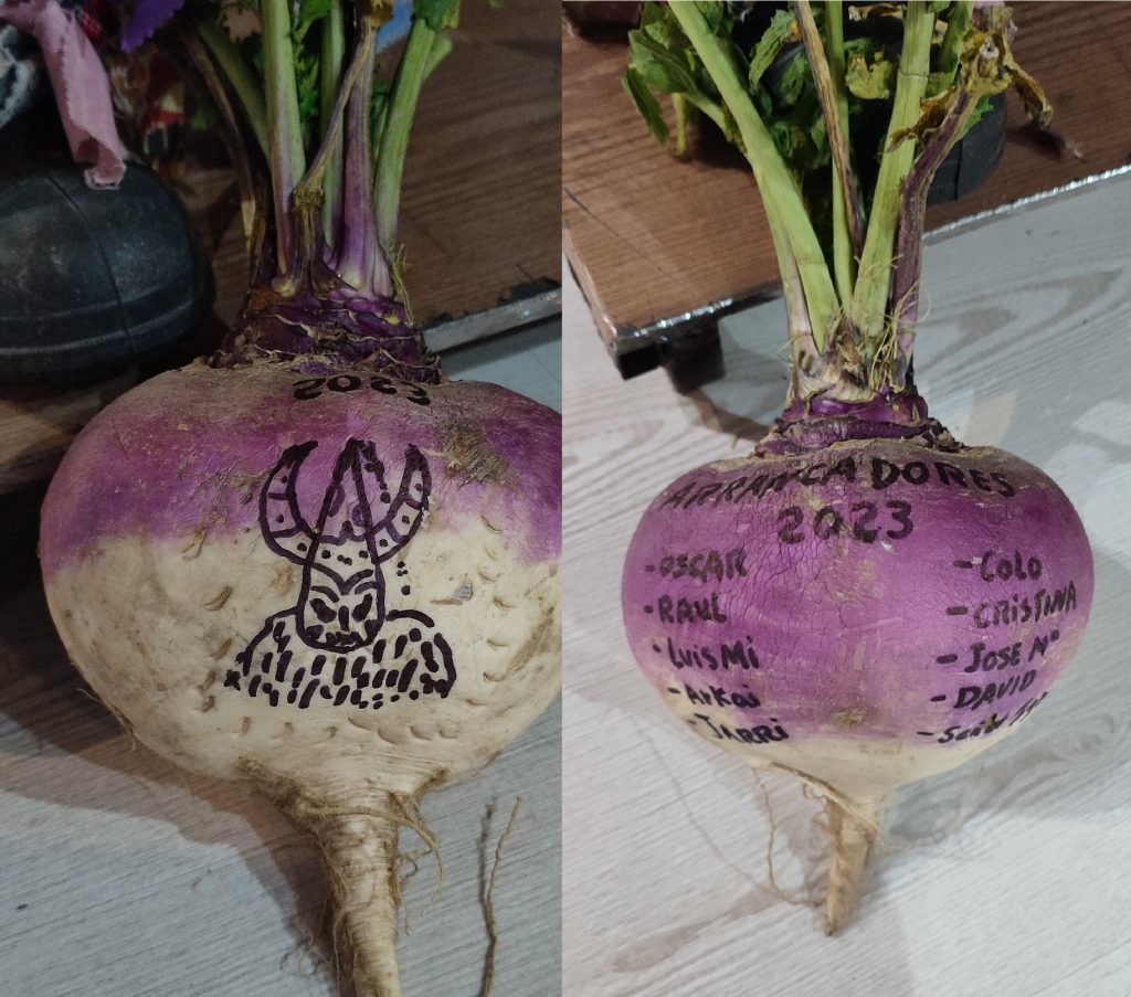 ¿En qué consiste esta parte de la fiesta? pues en aprovisionarte de nabos y tirárselos al místico ser, a nosotros al principio nos daba cosa, luego te vas adentrando en la fiesta y lo empiezas a disfrutar muchísimo, eso sí, agujetas al día siguiente de tanto agacharte. Hay montones con nabos cada poco, yo aconsejo cogerlos pequeños, redondos y varios con una mano que te pones a la altura de las costillas, por lo que pueda pasar y lanzar con la otra mano que también utilizas para taparte la cara, esto último porque al chocar contra Jarramplas la mayoría de nabos se rompen y algunos, los grandes, revotan y nunca se sabe… 😅