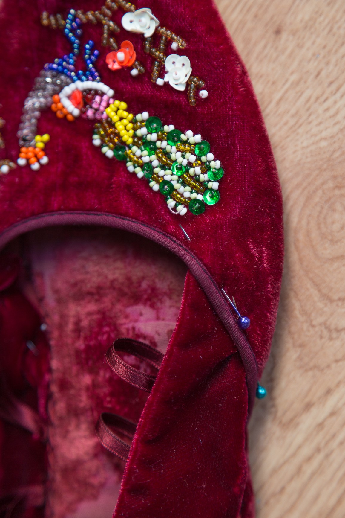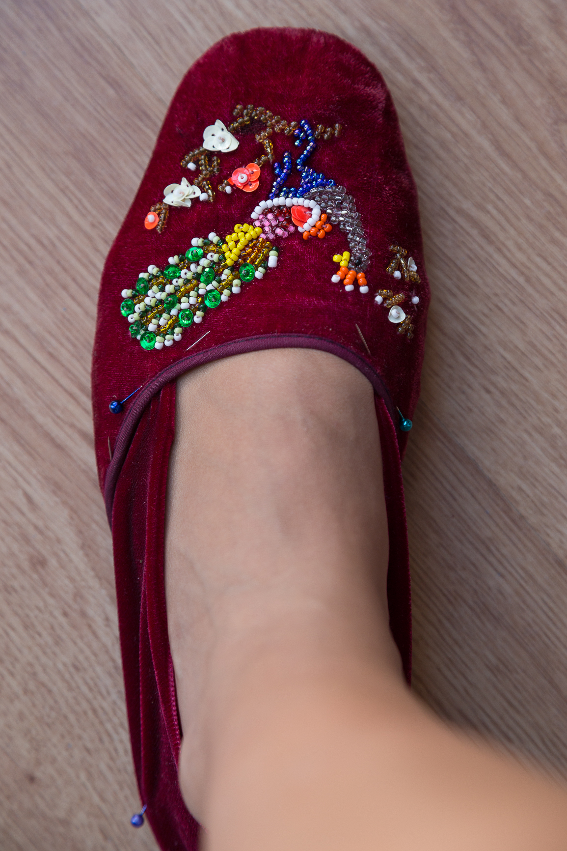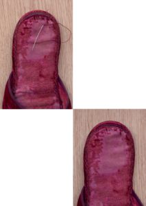 7º Paso: cosemos a máquina los laterales de la pieza resultante a la puntera por la parte delantera. Después sujetamos la parte de abajo a la zapatilla con alfileres y unimos ambas partes a mano.