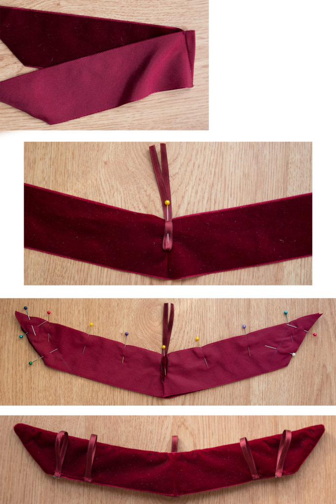 5º Paso: Colocar la tela del talón con alfileres hasta tener la forma deseada. En mi caso corté 4 cintas iguales dos para cada pie (Tejido exterior y forrro)